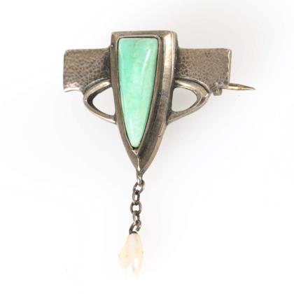 Stiltypisch reliefierte Brosche mit zargengefasstem Cabochon und kleiner, abgehängter Perle. Hakenverschluss