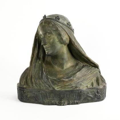 Nach rechts geneigter Kopf Elisabeths mit verträumt gesenktem Blick, umhüllt von einem großen Tuch, das von einem Diadem gehalten wird. Sockel mit Figurenreliefs, in der Mitte Rollwerk mit Bezeichnung "Elisabeth"