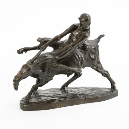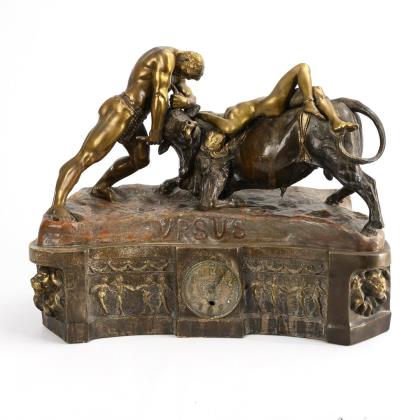 Geschwungener Sockel mit antikisierendem Figurenfries und seitlichen Löwenmaskaronen, bekrönt von einem flachen, "Ursus" bezeichneten Natursockel mit einer Kampfszene zwischen dem jungen Krieger Ursus und dem Stier mit einem gefesselten Mädchen. Sockel mit Jugendstil-Zifferblatt, 1 Zeiger fehlt, Gehwerk defekt