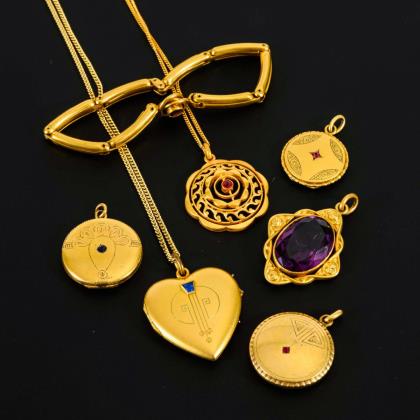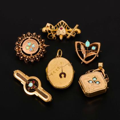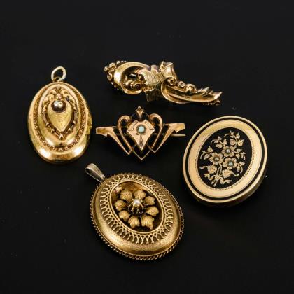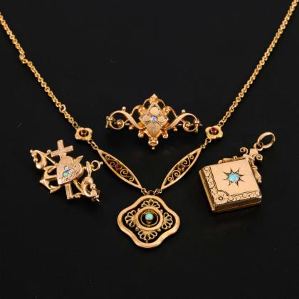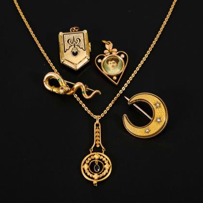 1 Medaillon mit Schwarzemail (2 Innenfächer, 1 Rahmen). Herzanhänger mit Perlchen und zeittypischer Fotoeinlage. Schlangenbrosche mit Imitationen. Sichelbrosche mit Perlchen. Filigraner Anhänger an Ankerkette mit defekter Steckschließe