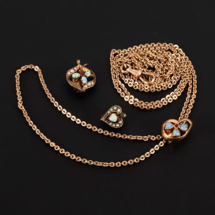 Collier, Medaillon (2 Innenfächer) und 2 reliefierte Broschen mit kleinen Opalcabochons. Ankerkette mit Steckschließe