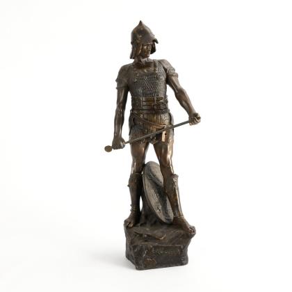 Stehender, römischer Krieger in Rüstung mit Rundschild, Schwert und Axt als Allegorie des Krieges, am Natursockel bezeichnet "La Guerre"