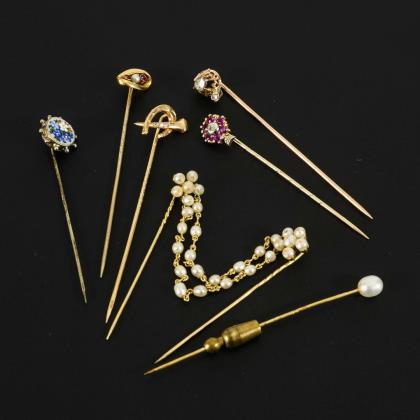 1 Doppelnadel mit Zuchtperlen, Nadelköpfe (u.a. mit Zuchtperle, Mosaik, Hufeisen mit Altschliffdiamanten, 2 gefassten Diamantrosen, Rubinen und Diamanten) an