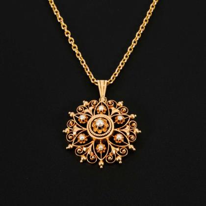 Filigraner Anhänger (ehem. Brosche) mit 7 krappengefassten Halbperlchen, an Ankerkette mit Ringfederschließe