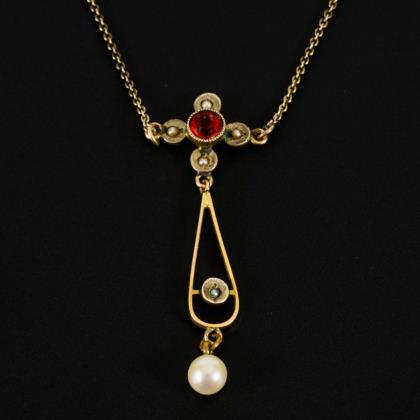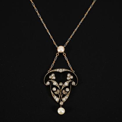 Jugendstilcollier mit Altschliff-Diamanten und Perlchen.