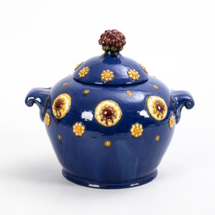 Bauchiges Henkelgefäß mit Noppendekor, gewölbter Deckel mit Fruchtknauf