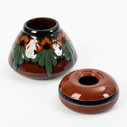 Konische Vase mit verengtem Hals und floralem Schlickerdekor (H 11 cm), flaches Rundgefäß mit stark eingezogener, getreppter Mündung, wohl Deckel fehlend (Modell-Nr. 508, Ø 12,5 cm)