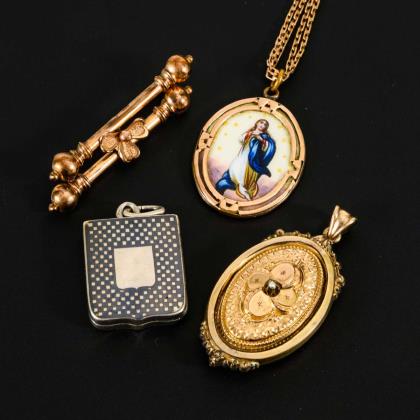 Reliefiertes Medaillon und Medaillon Tulasilber, mit je 2 Innenfächern. Emaillierter Anhänger mit Heiliger Maria, an 2-reihiger Ankerkette. Reliefierte Brosche mit Hakenverschluss