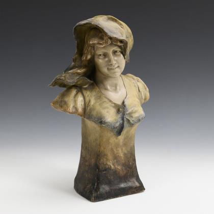 Jugendstil-Büste: Junge Frau mit Kopftuch. Wiener Manufaktur Friedrich Goldscheider.