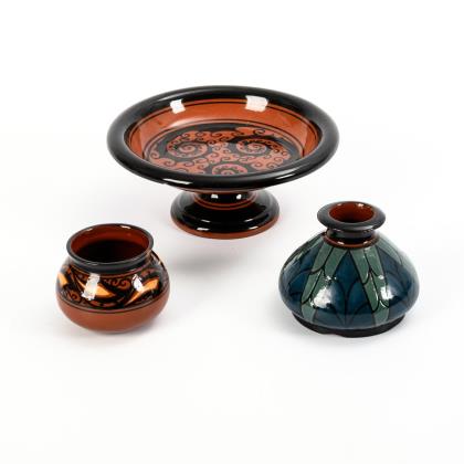 Tafelschale mit Rundfuß und Spiraldekor (Modell-Nr. 473, H 7,5 cm, Ø 18,5 cm), Enghalsvase mit blauer Schlickerbemalung (Modell-Nr. 491/494, H 8 cm), bauchige Vase mit ornamentalem Schulterfries (Modell-Nr. 496, H 6 cm)
