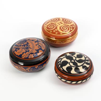 Runde Deckelgefäße mit teils reliefiertem Dekor (Eidechsen, Blätter, Spirale)