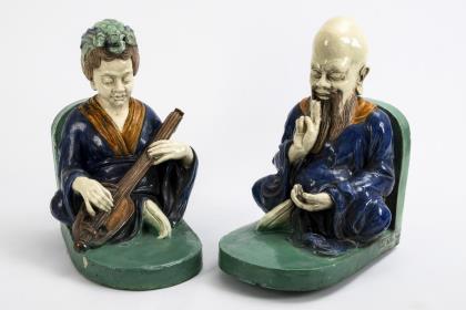 2 sitzende, asiatisierende Figuren auf einem gewinkeltem Sockel. Männlicher Asiate mit symbolischer Handhaltung in Anlehnung an buddhistische Handgesten, Asiatin beim Spielen eines Saiteninstruments