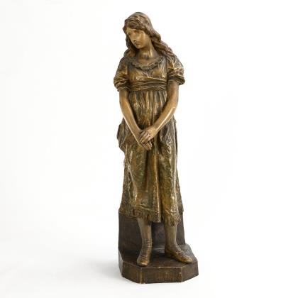 Auf einem Steinsockel stehendes Bauernmädchen mit langem Haar und langem Kleid, nach rechts blickend mit übereinandergelegten Händen