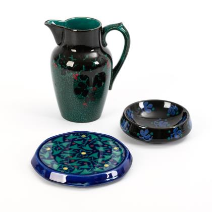 Saftkrug mit Traubendekor (Modell-Nr. 6733, H 17,5 cm), runde Schale (Modell-Nr. 6561, Ø 12,5 cm) und achteckiger Untersetzer (Modell-Nr. 7090, Ø 16,5 cm) mit Blättern