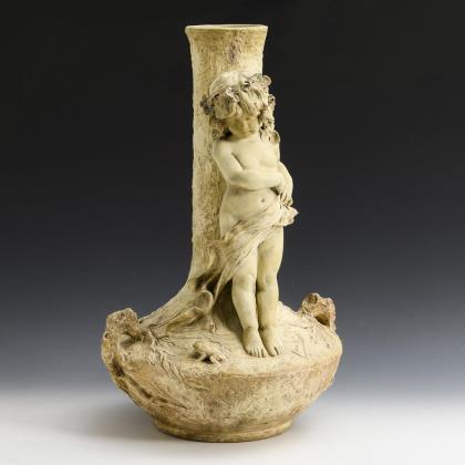 Enghalsvase mit niedriger, kantig abgesetzter Schulter und breitem Bauch, naturalistisch strukturierte Oberfläche mit teilplastischem Dekor. Am Vasenhals stehende Kinderfigur mit Rosen geschmücktem Haar, auf einen kleinen Frosch zu ihren Füßen blickend