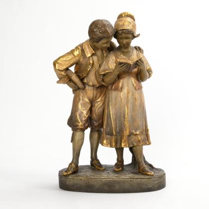 Große Jugendstil-Figurengruppe: Lesendes Kinderpaar. Wiener Manufaktur Friedrich Goldscheider.