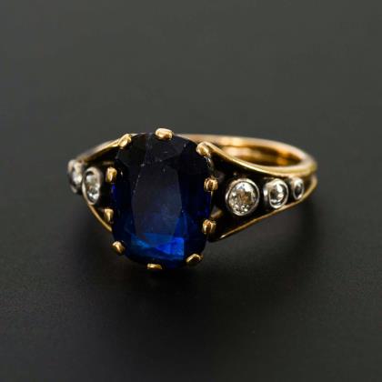 Kleine Brosche mit Saphir und Altschliffdiamant, um 1900.