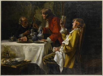 Drei ausgelassene Männer am reich gedeckten Tisch in der Kleidung des 17. Jahrhunderts