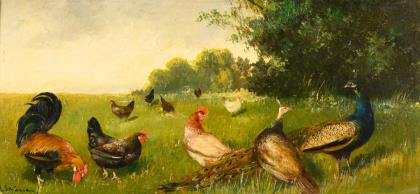 SCHÖNIAN, Alfred (1856 Frankfurt/Oder - nach 1936 München). Gockel, Hennen und Pfauenpaar.