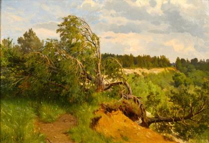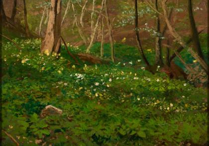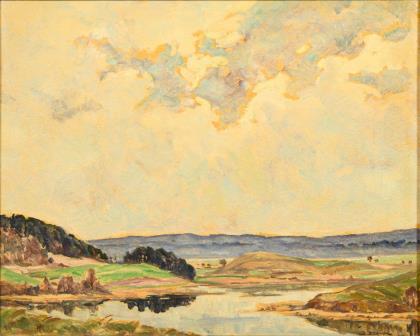 Ein Ruhe charakterisierender Landschaftsausschnitt in hellem Kolorit. Goldrahmen