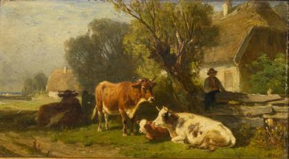 VOLTZ, Friedrich (1817 Nördlingen – 1886 München). Rinder vor Bauerngehöft.