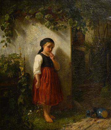 Schuldbewusst und nachdenklich an der Hauswand stehendes Mädchen neben einem blauen, in Scherben liegendem Krug. Aufgeführt in Boetticher Malerwerke, Bd. I,1, S. 94, Nr. 8