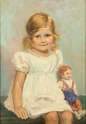 Porträt eines Mädchens im weißen Kleid mit Puppe