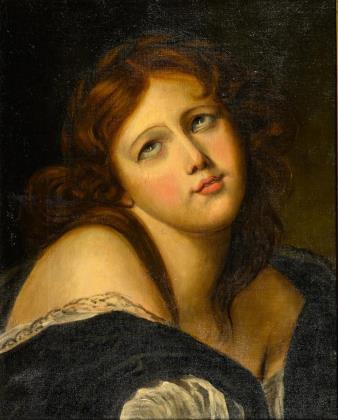 Bildnis einer Frau mit lockigem Haar und in transparenter Kleidung vor neutralem Hintergrund