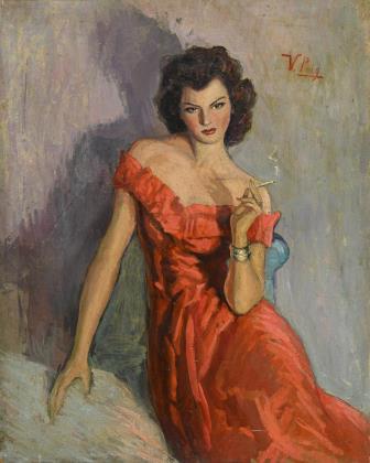 Bildnis einer jungen Frau im roten Kleid mit Zigarette und strengem Blick