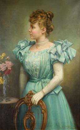 Porträt einer jungen Frau im schwarzen Kleid mit hochgestecktem Haar und roter Brosche