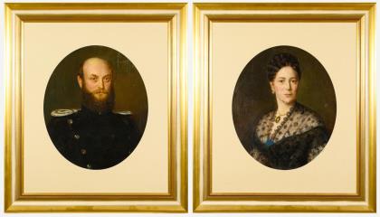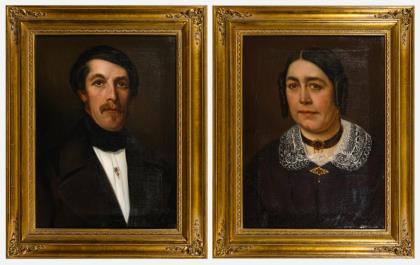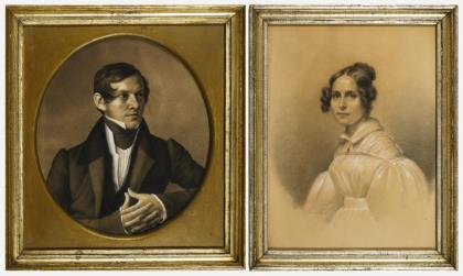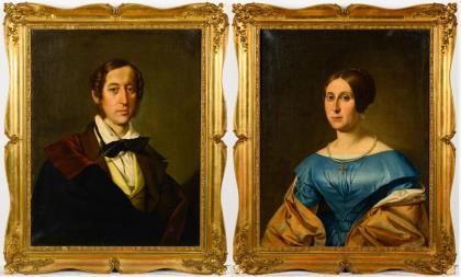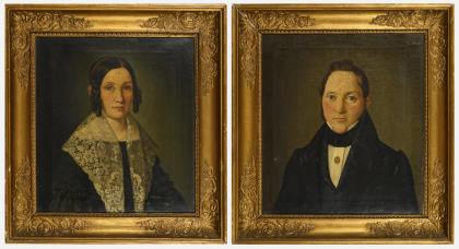 Porträt eines Mannes im schwarzen Gehrock mit Stehkragen vor neutralem Hintergrund sowie Bildnis einer Frau mit gelocktem Haar und im dunklen Kleid