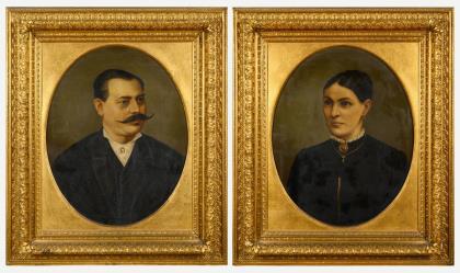 Porträt einer jungen Frau im schwarzen Kleid mit goldener Brosche sowie Bildnis eines Mannes mit Schnurrbart und im schwarzen Anzug mit goldenem Hufeisen am Hemdkragen