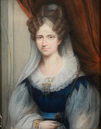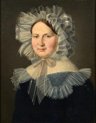 Porträt einer jungen Frau im dunkelblauen Kleid mit Spitzenhaube vor neutralem Hintergrund