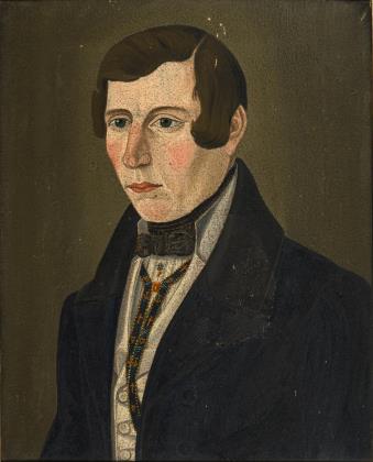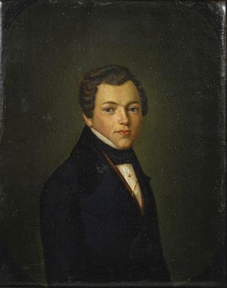 Bildnis eines jungen Mannes im grünen Gehrock mit weißem Hemd vor neutralem Hintergrund