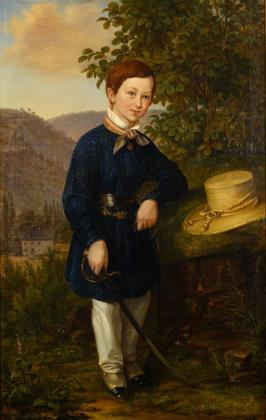 Porträt eines Jungen in Gehrock mit Stehkragen vor zeittypischem wolkigem Hintergrund