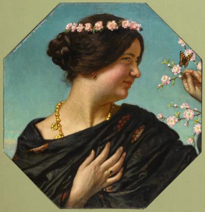 Jugendstil-Bildnis einer jungen Frau mit schwerer goldener Kette sowie Blumen im Haar an einem blühenden Obstbaum mit Tagpfauenauge