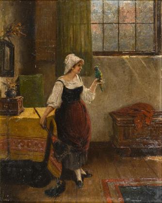 Junge Frau mit Staubwedel und dem Papagei in der Stube