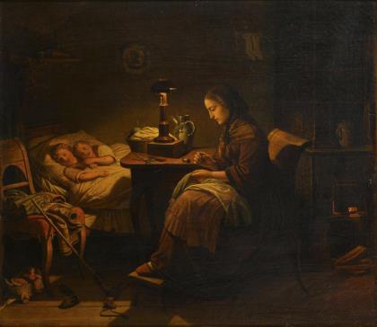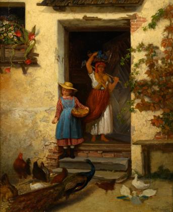 Genremaler: Mutter und Tochter im Hühnerhof.