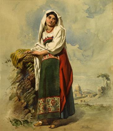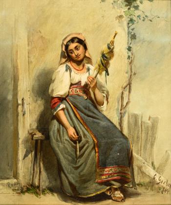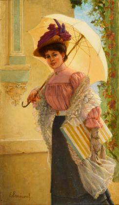 Undeutlich signiert: Magd mit Paradiesvogel