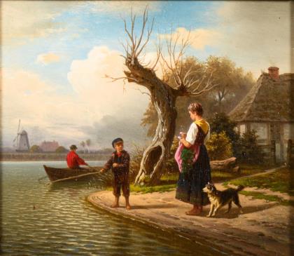 Eine spannungsreich bewegte Szene in romantischer Teichlandschaft von gediegener Ausführung. Originaler Keilrahmen, vergoldeter Stuckrahmen