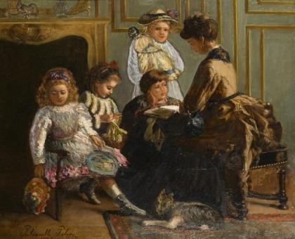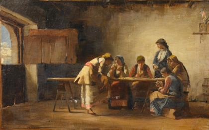 Genremaler: Mutter und Tochter im Hühnerhof