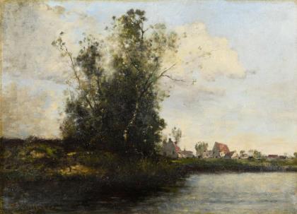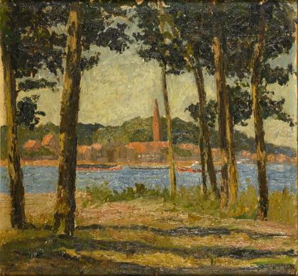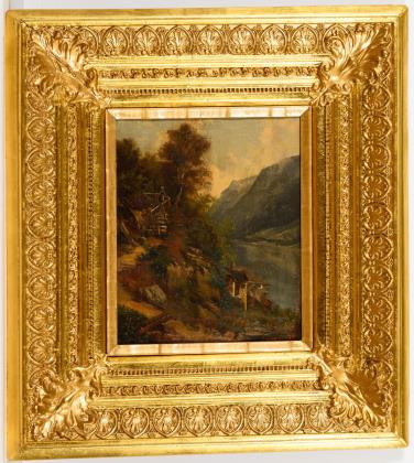 Ein Ruhe charakterisierender Landschaftsausschnitt in hellem Kolorit. Goldrahmen
