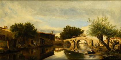 Wäscherinnen am Fluss nahe der steinernen Bogenbrücke zwischen den Häusern unter wolkigem Himmel