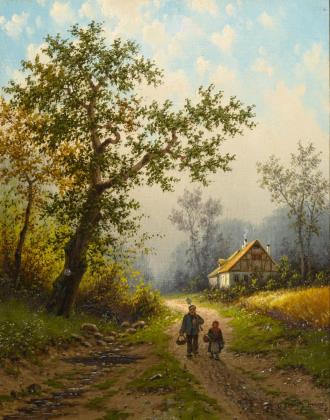 Staffagefigur auf dem Weg zum Haus unter großen Bäumen nahe dem Wald