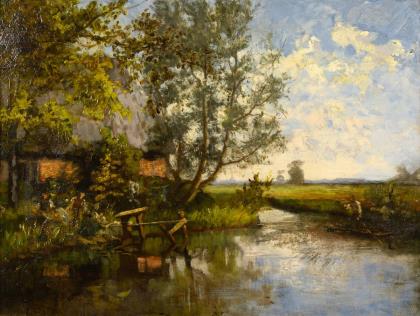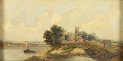 VICKERS, A.. Flusslandschaft mit Dorf und Fischerboot.