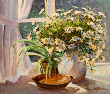Margeriten in heller Vase auf dem Fenstersims neben Topfpflanze im Sonnenschein