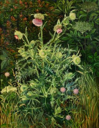 Im Stil der Neuen Sachlichkeit gemalte blühende Pflanze in der Wiese vor größeren Gewächsen