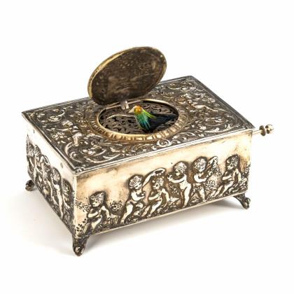 Quaderdose allseits reich mit Girlanden knüpfenden Putten reliefiert; obenauf ein Rankenornament mit 2 Putten sowie zentraler Scharnierdeckel mit 2 Putten am Vogelkäfig. Mittels seitlichem Zughebel auszulösendes Werk. Unter ovalem Scharnierdeckel beweglicher Vogel mit bunt-schillernden Federn über à-jour gearbeiteter Werk-Abdeckung