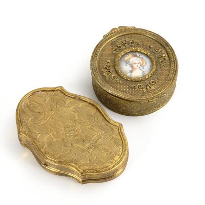 "Bornel" bezeichneter Miniatur unter Verglasung auf dem Scharnierdeckel der runden Dose mit feinem Reliefornament. / Vergoldete Dose in barock geschwungener Form mit feiner "Gravur"