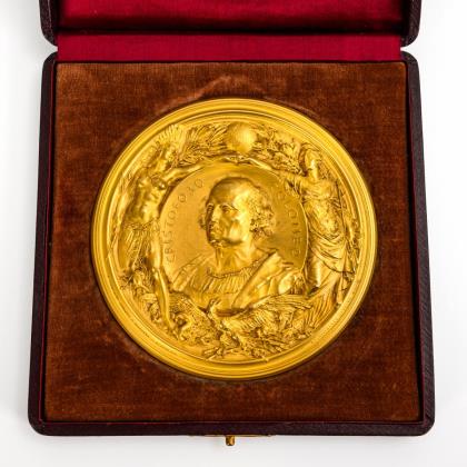 Beidseitig reich reliefierte Medaille. Avers Brustbildnis von Christoph Kolumbus mit Legende "Cristoforo Colombo", flankiert von den Allegorien für Amerika und Europa. Revers Georg der Drachentöter mit römischem Datum 1492 sowie Legende zur Genua-Konferenz; oben von Genien getragene leere Kartusche